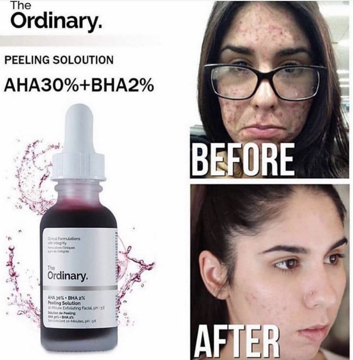 The Ordinary AHA 30% + BHA 2% Peeling Solution es un exfoliante facial de alto rendimiento que combina dos potentes ácidos: el AHA (alfa-hidroxiácido) al 30% y el BHA (beta-hidroxiácido) al 2%. Este tratamiento exfoliante proporciona una exfoliación profunda, eliminando células muertas y limpiando los poros para mejorar la textura y el brillo de la piel. Es adecuado para todo tipo de piel, incluyendo piel sensible, y ayuda a reducir la apariencia de líneas finas, arrugas y poros dilatados.